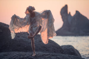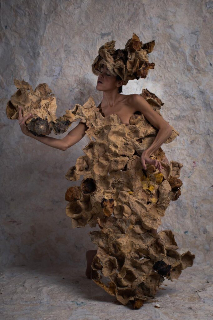 Maumae is an interdisciplinary artist and teacher, with movement art as the foundation of her work. Having begun her creative practice with visual arts (drawing, painting and figurative sculpture), she now creates costumes, installations, and wearable sculptures from organic and recycled materials, which she incorporates into her performances. These performances also include live soundscapes created by various musicians and sound artists. She also utilizes her voice and the sonic elements of her costume and installation materials.