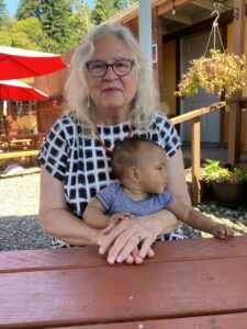 Her paintings draw on Pacific Northwest bounty: tulips grown in nearby fields, garden flowers, images of salmon, Dungeness crab, shellfish, and sea weed.