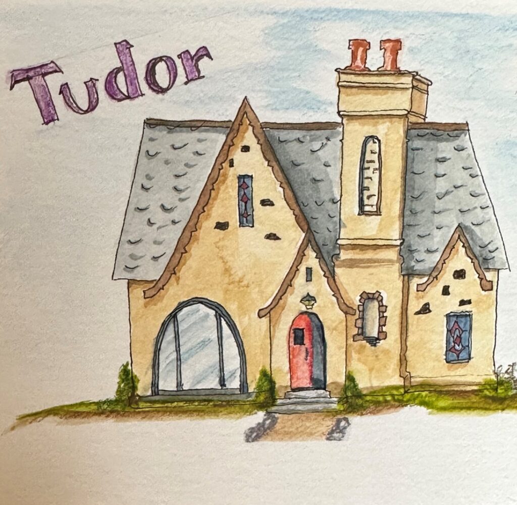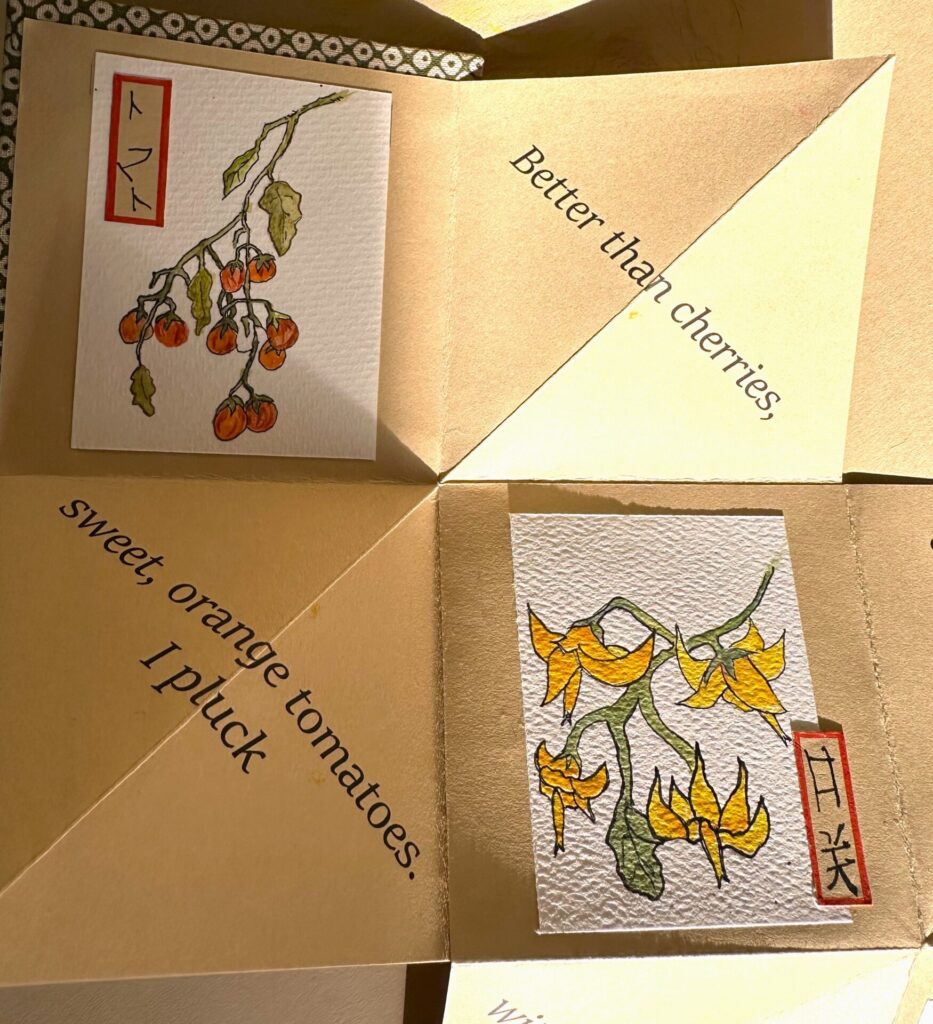 Watercolor pencil and ink; Japanese Katakana for "Tomato" and "Blossom"