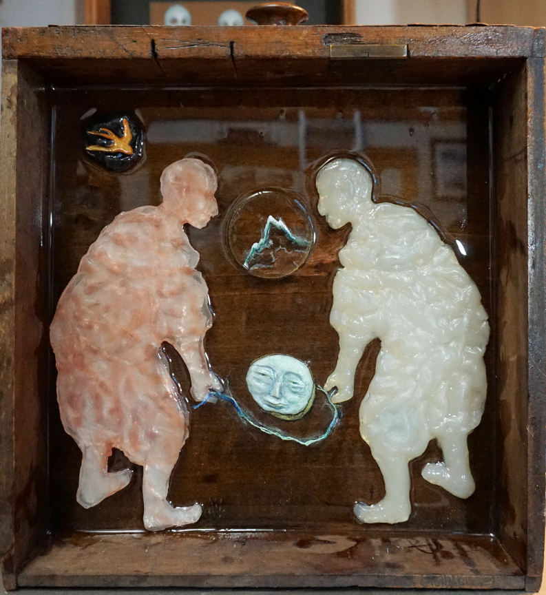 I am a mixed media artist in the full sense of the phrase: I make & take, use & re-use. I draw, paint, take photos, cut, grind, shape, paste, print, copy, erase, assemble, cut again, hammer, drill & repeat. I include natural objects in my work, & use translucency & light with acrylic and clear resin. I am influenced by nature, the state of the world, the state of my loved ones, and by the weight of the past, good & bad.